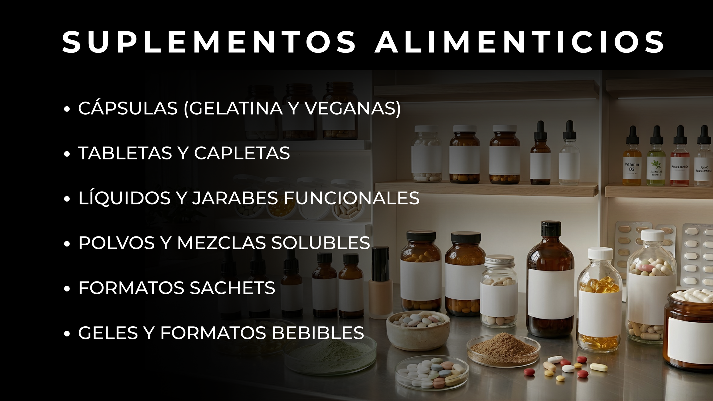POLVOS - CÁPSULAS - TABLETAS - LÍQUIDOS - GELES - CREMAS - UNGÜENTOS - SHAMPOOS - PRODUCTOS CAPILARES - SERUMS - EXFOLIANTES -